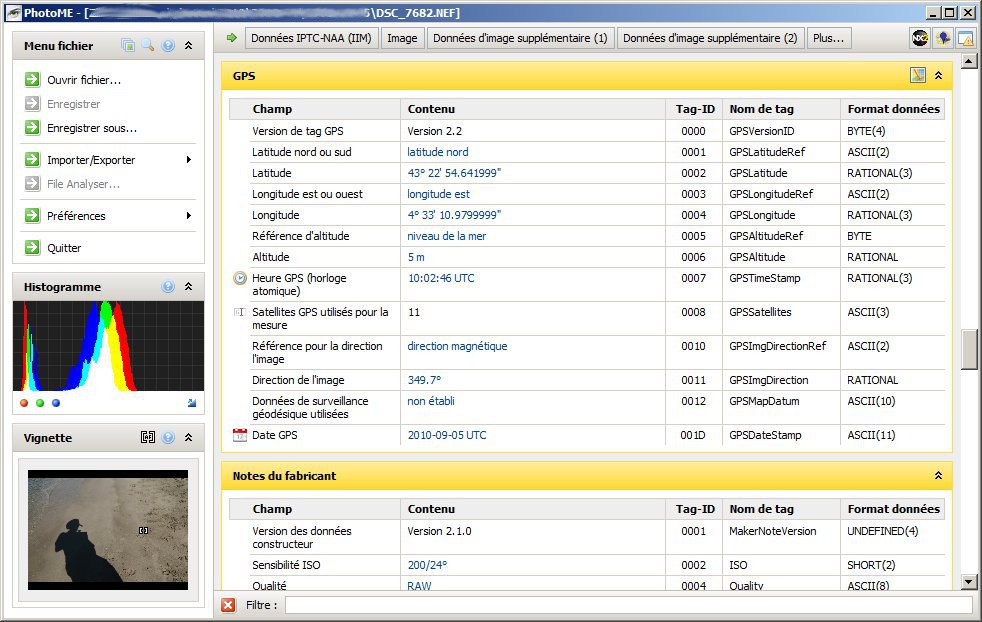 La dénomination des champs est explicite, seul le champ GPS Map Datum reste vide, sa valeur étant WGS84. Les champs GPS Time Stamp et GPS Date Stamp étant en UTC.