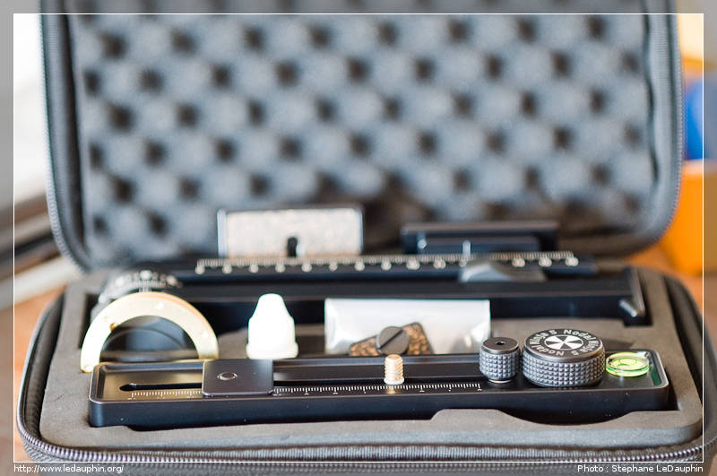 Je conseille de noter la position de la glissière de calage du point nodal, celle-ci variant en fonction de l’optique et de la focale pour les zooms. Il est possible de se servir des valeurs mentionnées ici http://wiki.panotools.org/Entrance_Pupil_Database, là http://www.swissarmyfork.com/lens_table_1.htm , là http://homepage.mac.com/gibie76/panophoto/00/Point_nodal/Point_nodal.htm ou encore http://www.nodalninja.com/support/camerasettings.html.